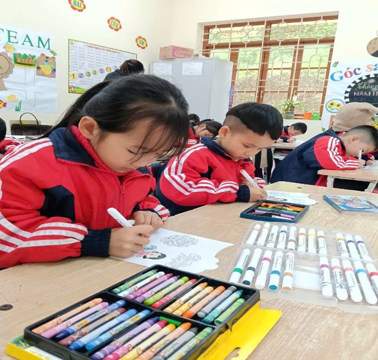 Học sinh được phát mẫu bao lì xì để tô màu và dán. Các em chăm chú thực hiện, tạo ra những sản phẩm mang màu sắc tươi vui của ngày Tết. Hoạt động giúp học sinh rèn sự khéo léo, sáng tạo và tinh thần làm việc độc lập.