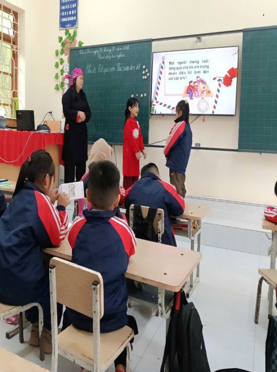 Học sinh được đóng vai các tình huống nhận lì xì ngày Tết. Các em thực hành nhận bằng hai tay, nói lời cảm ơn và chúc Tết lễ phép. Qua đó, học sinh hiểu và ghi nhớ cách ứng xử đúng mực, lịch sự.